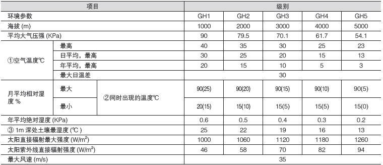 注:①最低溫度可取-10、-25、-10 及+5℃四種之一種; ②月平均最大相對濕度及同時(shí)出現的溫度中的參數值,分別表示海拔0~1 000,1000~2000,2000~3000,3000~4000,4000~5000m 處的參數值; ③由于我國目前只有0.8m 深處觀(guān)測值,故表中所列為此等值,最熱月1m 深處土壤溫度接近二稍低于0.8m 深處之值。