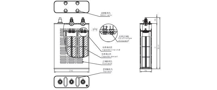 ¤ High capacitance stability, capacitance annual attrition rate less than 1%, standard life more than 100000 hours; ¤ Low dielectric loses, superior self-healing superior; ¤ Unique structure, good heat dissipation and ventilation effect, oil free, environmentally friendly does not pollute; ¤ Capacitor cores using independent aluminum shell packaging and safety explosion protection, safe and reliable; ¤ Small volume, light weight, can be multi-angle installed. ¤ Especially suitable for abnormal environment, has a good abilyit to compete.